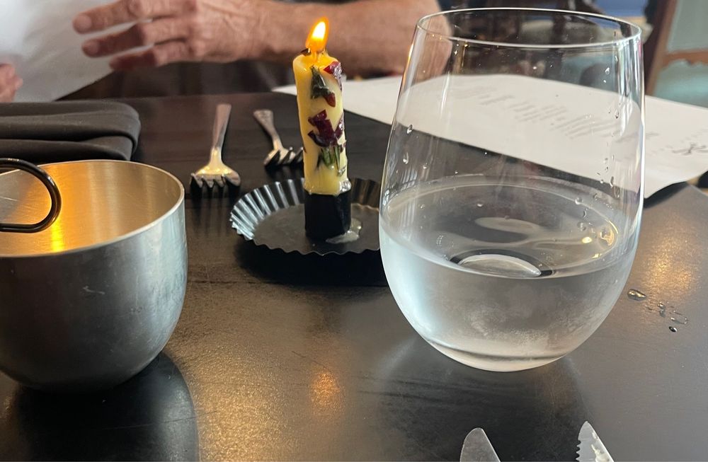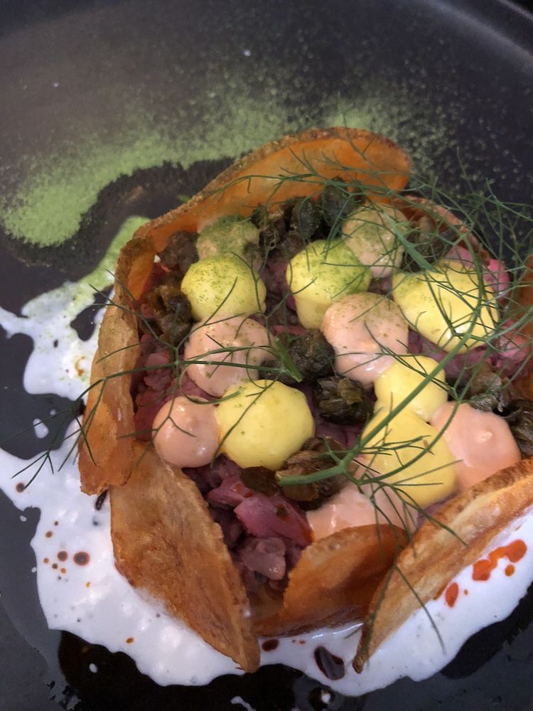 Sous vide mid rare tenderloin, egg yolk mousse, fried caper, seasoned buttermilk, pepper oil, served with house saltines