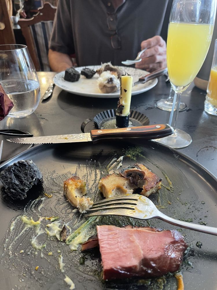 Sliced duck ham or Ahi pastrami, black biscuits, brandied gold raisin jam