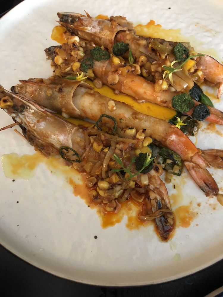 Pan-seared prawns, savory french toast, bacon, egg white caviar, cured yolks